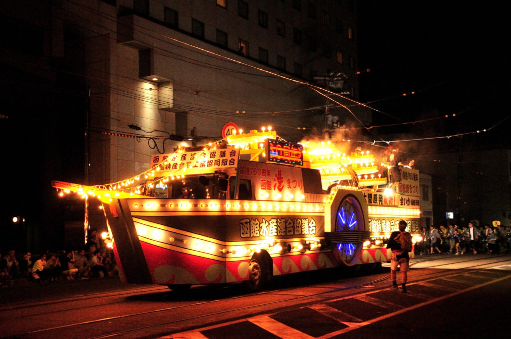 8月1日ー5日 函館開港160周年 港まつり 4時25分から8時過ぎまで大通りを通行止め 行政民間各団体がパレード 踊りながら いか踊り 函館名物 いか踊りいか刺し シオカラ いかソーメン もひとつおまけに いかポッポ いか いか いか いか いか踊り