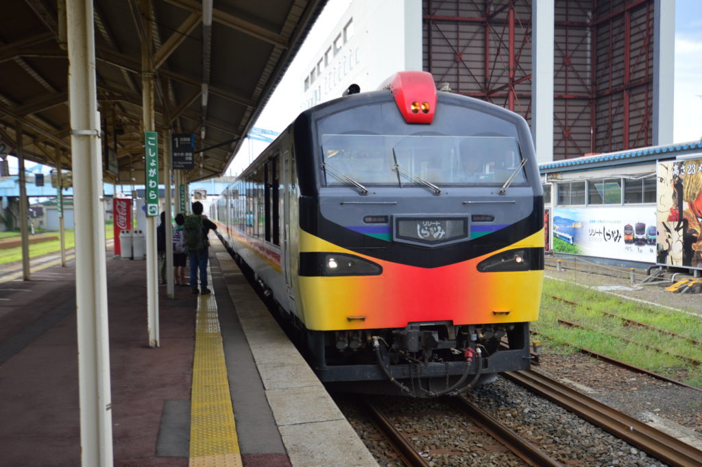 朝は太陽が出て晴れてるが天気予報を見ると午後には大雨予報 自転車での走行はあきらめて JR五能線リゾートしらがみで行くことにした 五能線は海岸線を照らす夕陽が有名だが 今回は雨をしのぐ為乗車 黄金崎不老不死温泉 事前に予約 最寄り駅についたら大粒の雨 迎えのバスあり 雨にぬれずにホテルに チェックイン 露天風呂を雨の中 入浴できず 残
