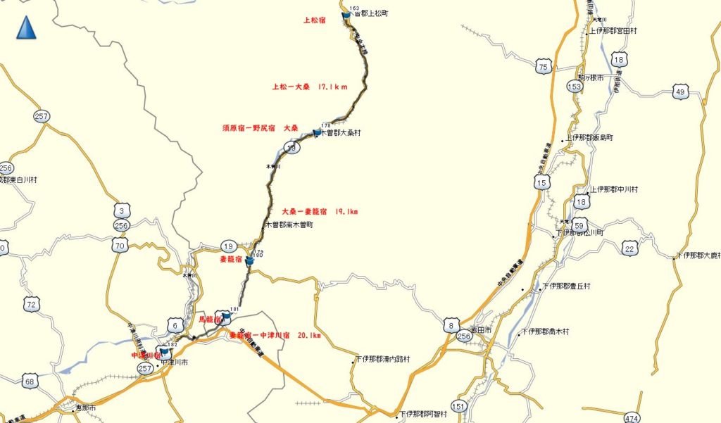 今回の中仙道 二泊三日のウオーキング 上松ー中津川 57kmの行程