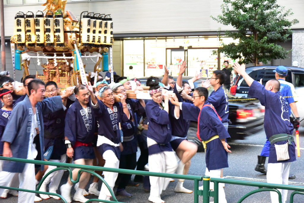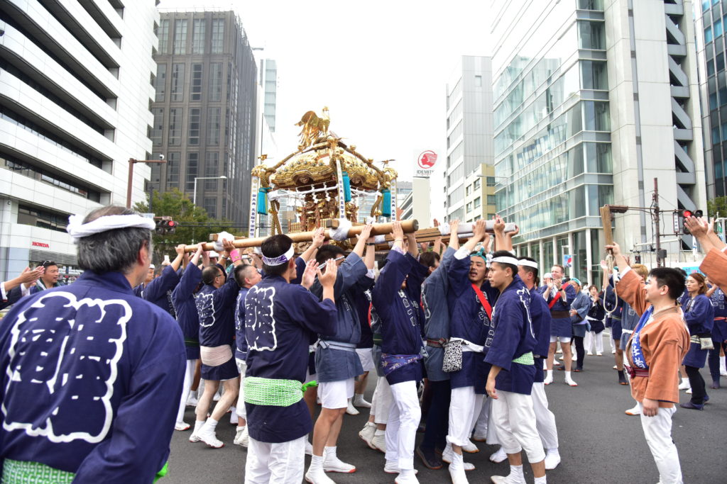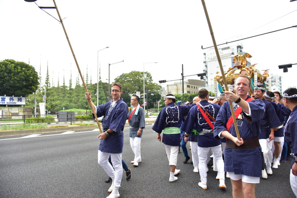 日曜日は神社に奉納 国道246 神宮外苑を担いで 氏子の外人が露払い