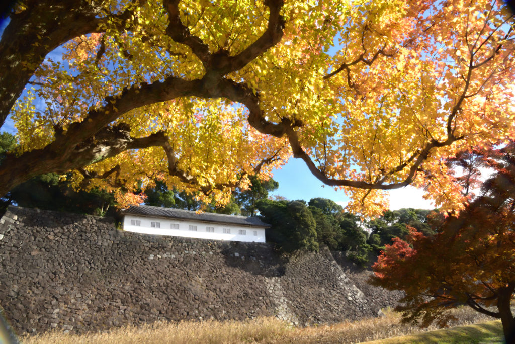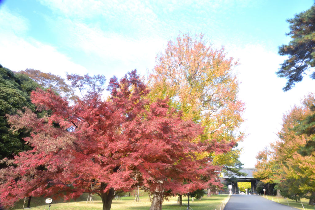 今年も通り抜けの季節になりましたが 今年は大嘗宮と通り抜けの紅葉が同時に見れるので大勢の人が来る予想されるので 早朝神宮外苑 銀杏並木と新国立競技場を見て10時ごろ二重橋到着 坂下門に向かう人 人 人 長い列が 荷物チェック 人体チェック後坂下門入場 左手に宮殿 宮内庁を見ながら乾門に向かう 吹上御門を過ぎ99.9999%の人が大嘗宮に行く西桔橋を渡り東御苑方向に 乾門に行くのは俺一人 気持ちがいいね
