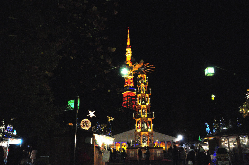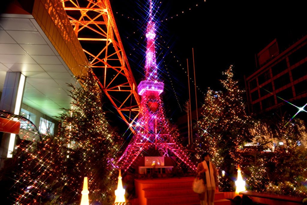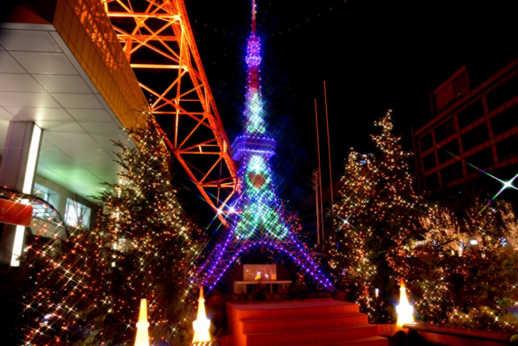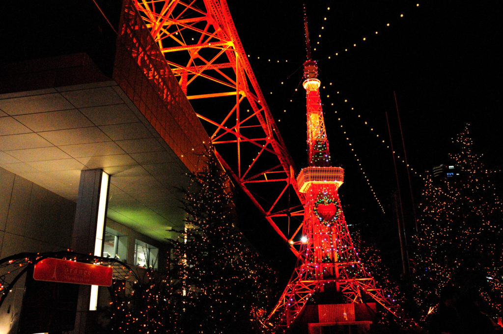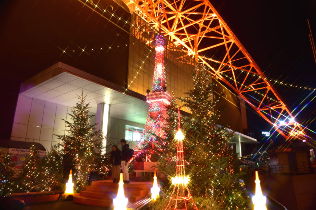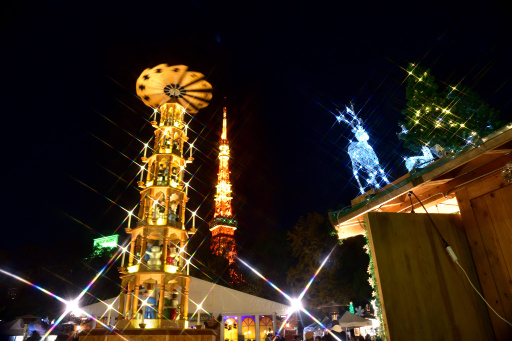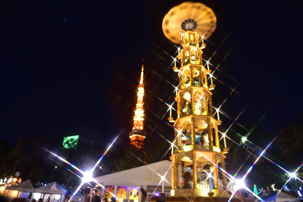 昨年まで日比谷公園で開催されてた東京クリスマスマーケット今年は場所を変更芝公園で シンボルのクリスマスピラミットと東京タワーとの競演 夕方以降が見どころ 飲んだり食べたりしながら 楽しんだ後 帰宅時に今年も東京タワーでウインターファンタジー 鉄製の11.mの東京タワー型オブジェ キャンドルタワー