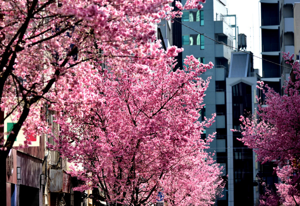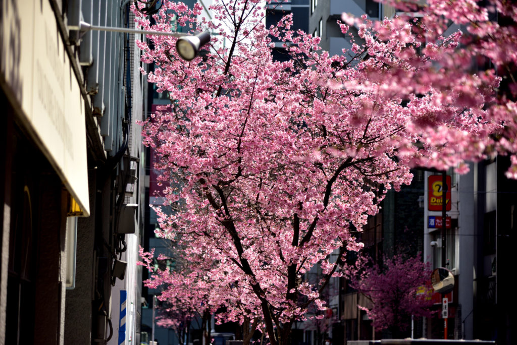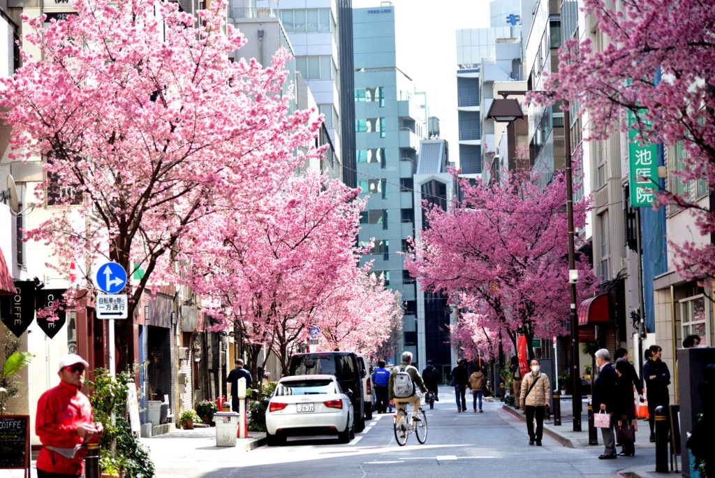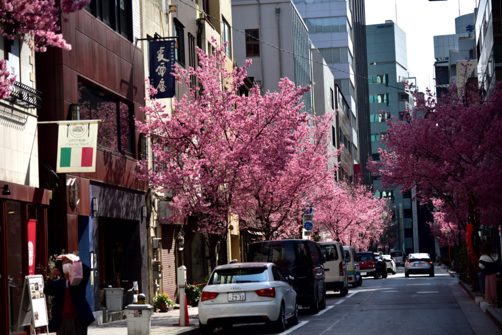今満開 日曜日 新型コロナウイルスの関係で外出自粛中 日本橋三越から一本はい行った通りなのだが人通りが少なかった