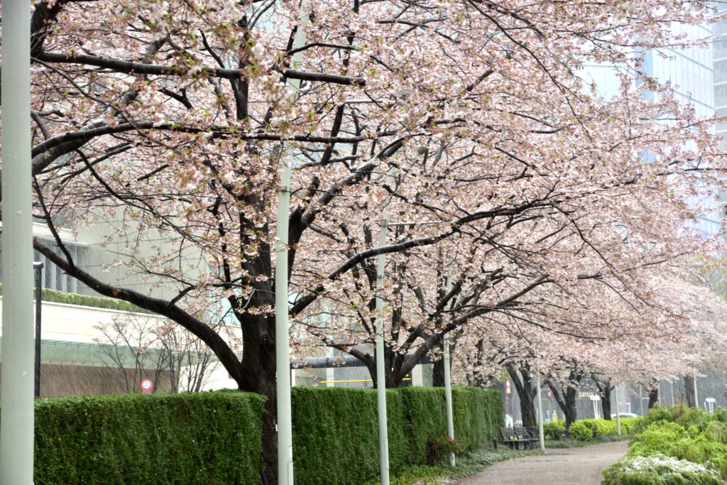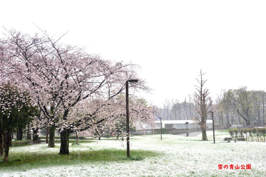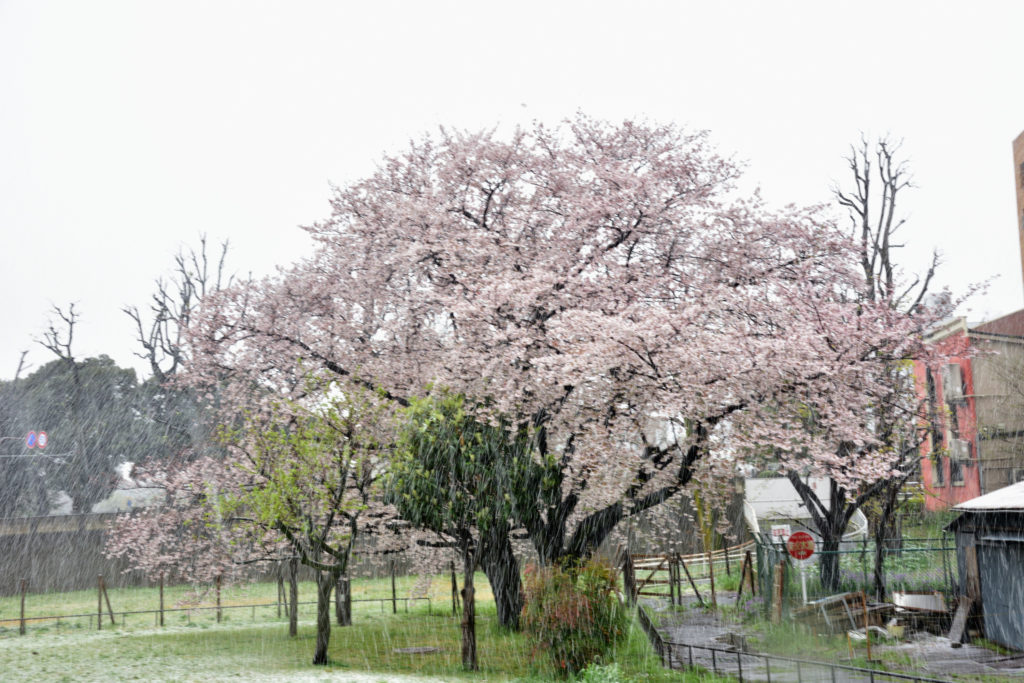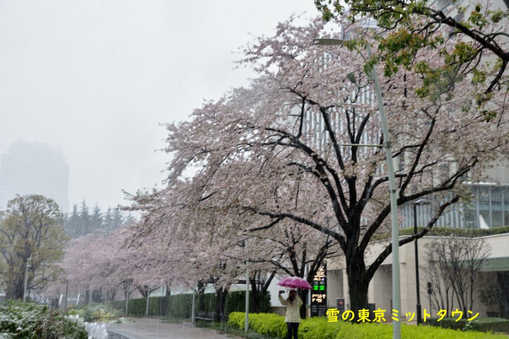 天気予報通り雪 やじ馬は近所の満開の桜と雪を寫しに