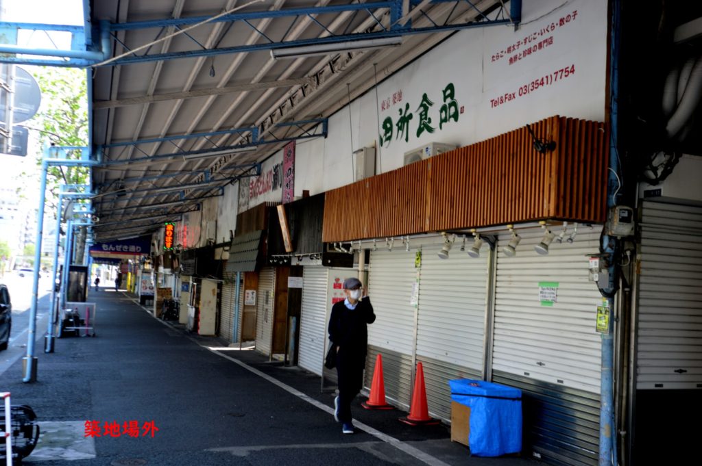 築地場外 門跡通り 毎週水曜場は自由営業日 今日は祝日 何時もなら観光客でにぎわってる通りだが 今日はこの通り お店は全部閉まってる