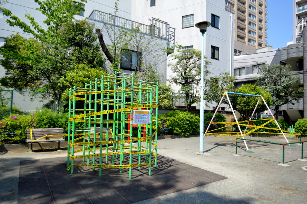 隣接の区立青葉公園 新型コロナ感染 拡大防止の為 遊具 ベンチ等にこのようなテープが張られた 昨日迄は子供の声が聞こえていたが