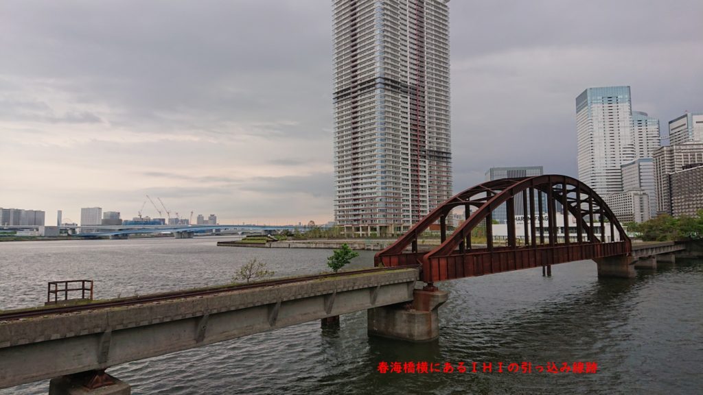 晴海通りで 豊洲を抜け 春海橋横にある IHI用のJR 引っ込み線跡 IHI跡地はこうそうじゅうたくが林立