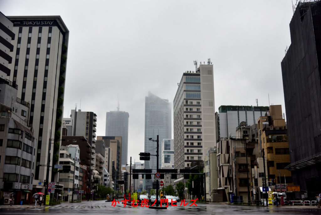 雨がやんできたが雲が低くH24年完成の超高層ビル 虎ノ門ヒルズがかすんでる
