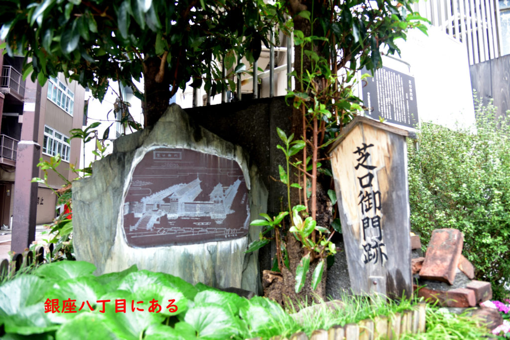 | 所在地 中央区銀座八-八・九・十付近 ここの南方、高速道路の下には、もと汐留川が流れ、中央通り(旧東海道)には、昭和三十九年まで新橋が架かっていました。 宝永七年(一七一〇)、朝鮮の聘使(へいし)の来朝に備えて、新井白石の建策にもとづきわが国の威光を顕示するため、この新橋の北詰に、現に外桜田門に見られるような城門が建設されて、芝口御門と呼ばれ、新橋は芝口橋と改称されました。 城門は橋の北詰を石垣で囲って枡形とし、橋のたもとの冠木門から枡形に入って右に曲がると、渡櫓があって堅固な門扉が設けられていました。しかしこの芝口御門は建築後十五年目の享保九年(一七二四)正月に焼失して以来、再建されず、石垣も撤去され、芝口橋は新橋の旧称に復しました |