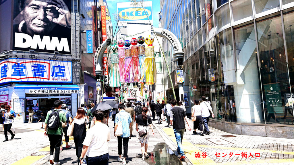 スクランブル交差点を渡るとセンター街入口 七夕の飾りが