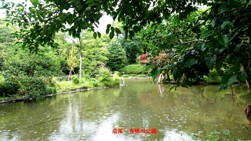 澁谷から広尾へ 雲が出てきて雨が降ってきた まあいいか 傘は持ち合わせなし 濡れて歩くのもいいか 緑が多い有栖川公園の池