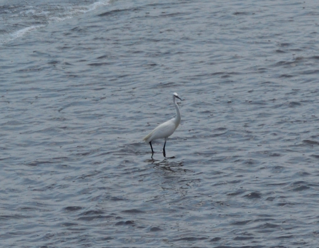 堰でシロサギが魚をねっらってる