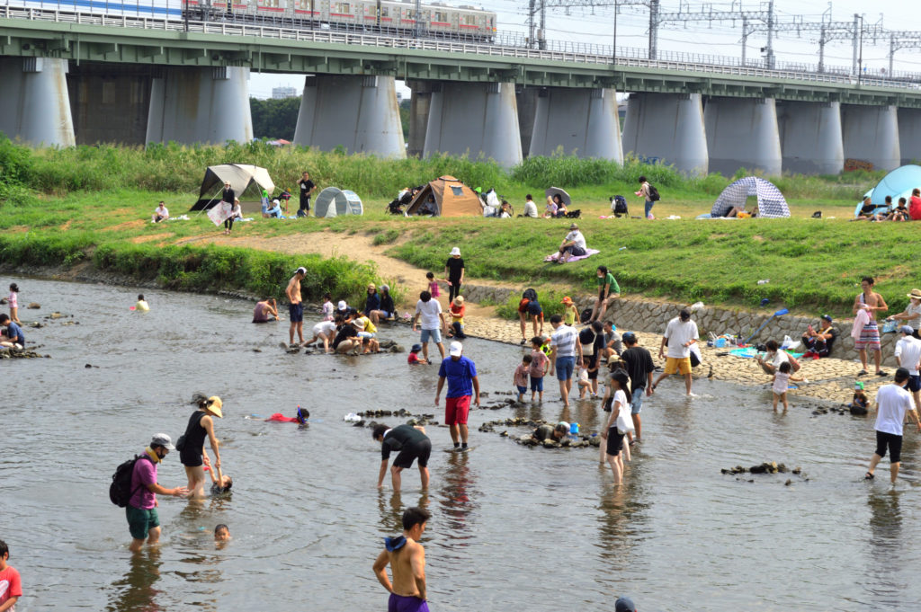 今日はお盆休み最終日 コロナ騒ぎで観光もままならず プールも閉鎖中 二子玉川駅で多摩川が分かれていて水遊び お父さん お母さんが頑張ってる