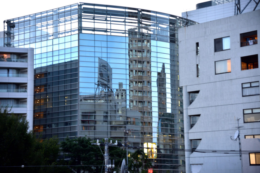 最近のビルはガラス窓で覆われてる 近隣のビルがこの様に映ってる