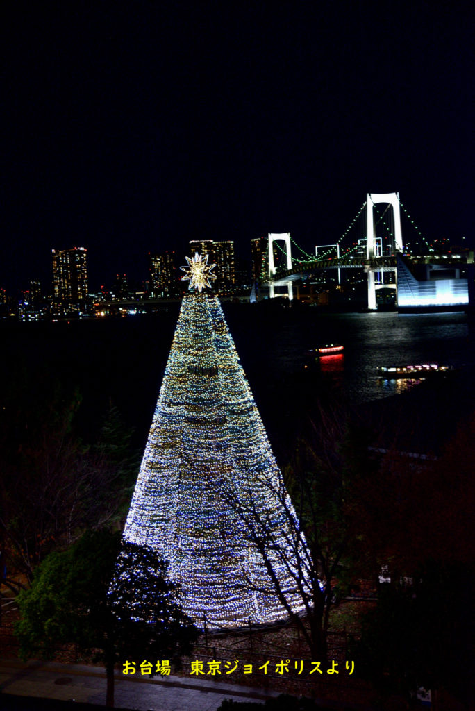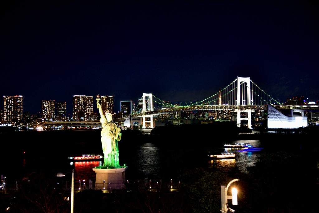 時間が早いのかレインボーブリッジの色が変化してない ここの場所はお台場の自由の女神 レインボーブリッジ 東京タワーが見れる場所