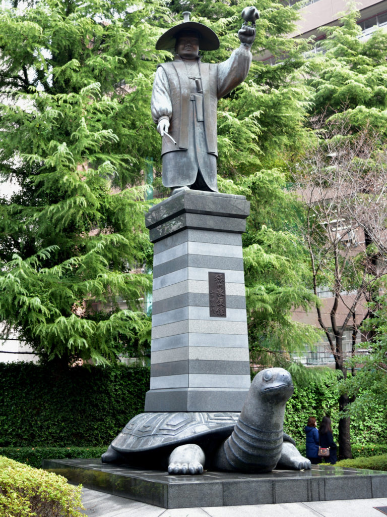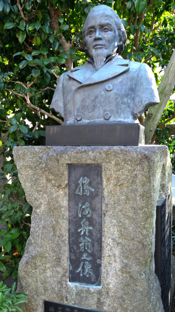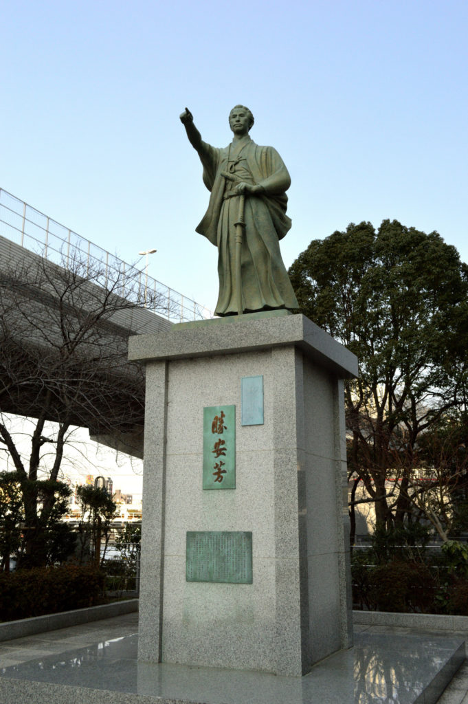 勝 海舟(かつ かいしゅう)は、江戸時代末期(幕末)から明治時代初期の武士(幕臣)、政治家。位階は正二位、勲等は勲一等、爵位は伯爵。初代海軍卿。 山岡鉄舟、高橋泥舟とともに幕末の三舟と呼ばれる。本所生まれの幕末の雄・勝海舟(1823年から1899まで)の銅像が市民グループ「勝海舟の銅像を建てる会」により、海舟ゆかりの地である区役所前うるおい広場の緑地内に建立された