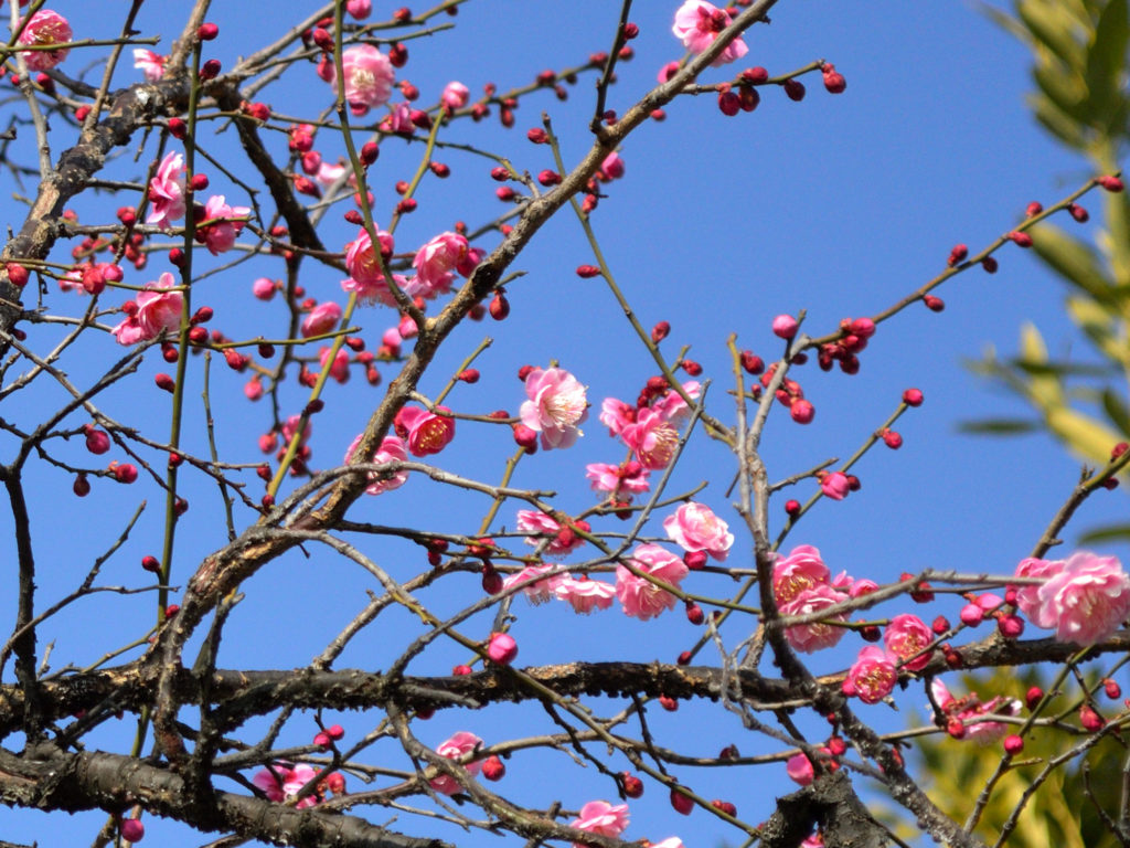 天気が良く温度も上がり梅が咲き始めた 三囲神社境内にある紅梅