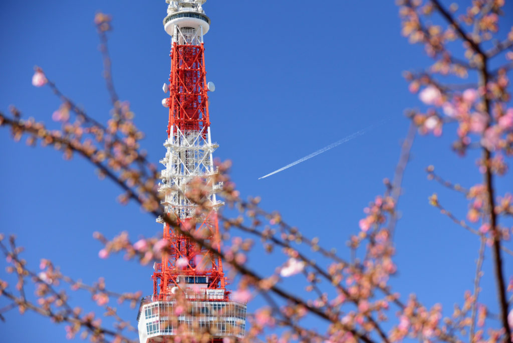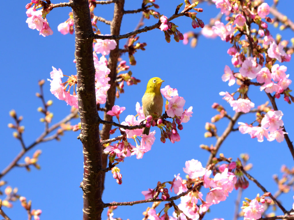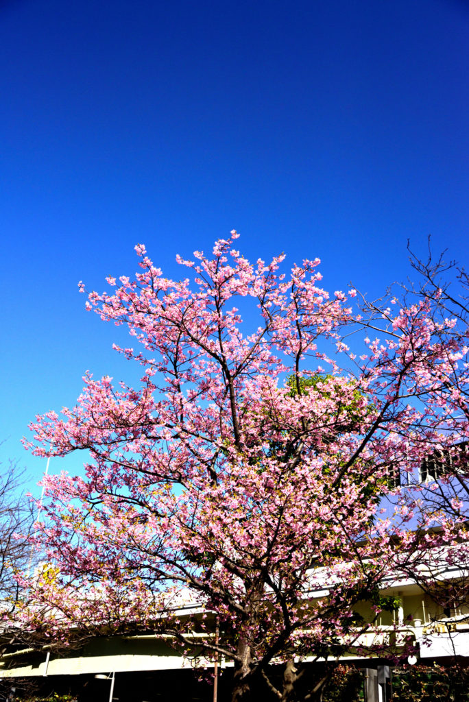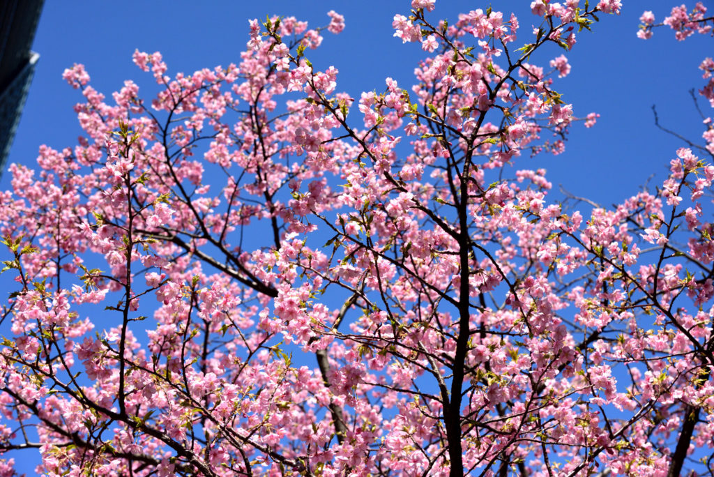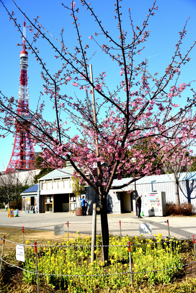 芝離宮と道路を挟んだ高速の横にカワズサクラが満開だった
