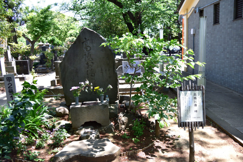 墓碑の高さは約2メートル、正面の幅は約1メートルの自然石で、中央に書かれた「高橋お伝の墓」の書は仮名垣魯文によるものです。向かって右には辞世「しばらくも望みなき世に あらむより渡しいそげ三途の河守」(仮名垣魯文の書)が、向かって左には「建主 小川市太郎」とあります。背面は、「明治14年1月3回忌和同開珎社 世話人仮名垣魯文」とあり、名前が列挙されています