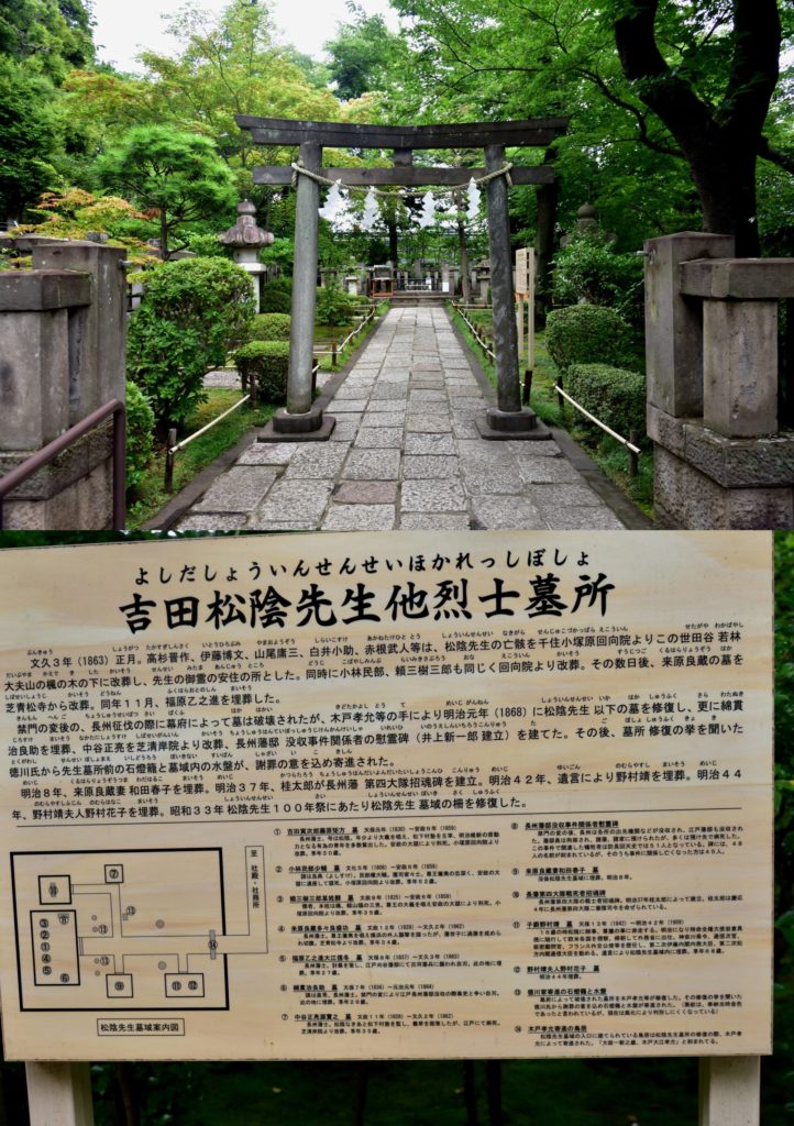 吉田松陰先生の墓碑をはじめとして、頼三樹三郎、小林民部、来原良蔵、福原乙之進、綿貫次郎輔、中谷正亮、其の他烈士の墓碑があります。 文久三年(1863)正月。高杉晋作、伊藤博文、山尾庸三、白井小助、赤根武人等は、松陰先生の亡骸を千住小塚原回向院よりこの世田谷若林大夫山の楓(紅葉)の木の下に改葬し、先生の御霊の安住の所としました。同時に頼三樹三郎、小林民部も同じく回向院より改葬。その数日後、来原良蔵の墓を芝青松寺から改葬。同年十一月、福原乙之進を埋葬。 禁門の変の後、長州征伐の際に幕府によって松陰先生以下の墓は破壊されましたが、木戸孝允等の手により明治元年(1868)に松陰先生以下の墓を修復し、更に綿貫治良助を埋葬、中谷正亮を芝清岸院より改葬、長州藩邸没収事件関係者の慰霊碑を建立しました。 明治2年整武隊長官が鳥居より墓前に至る道に石を敷いて参拝に便ならしめ、かくして墓域は完成し、忠魂の鎮座することとなりました。鳥居は桂太郎 奉納