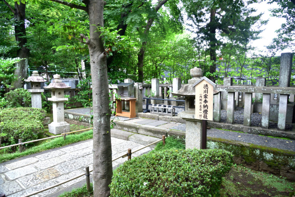お墓に入る前には徳川家奉納の左右一対の石灯篭と手前に水盤がある