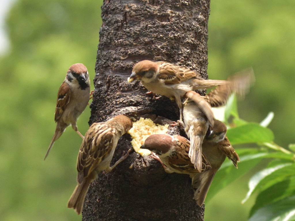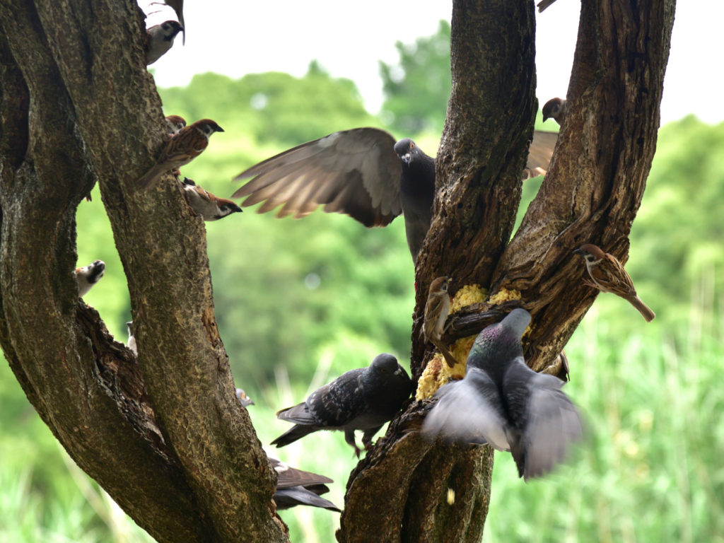 弁天堂横にあるお休み処 この周りにはいろいろな供養塔 碑がある 眺めながら休憩 スズメが集まってる 見ていると不忍池手すりを水洗いしている人が 手すりの清掃を終わるとカステラの切れ端を樹木の隙間に またお米をまき始めた 餌やり禁止なのでそれなりに気を使ってやっているのだな