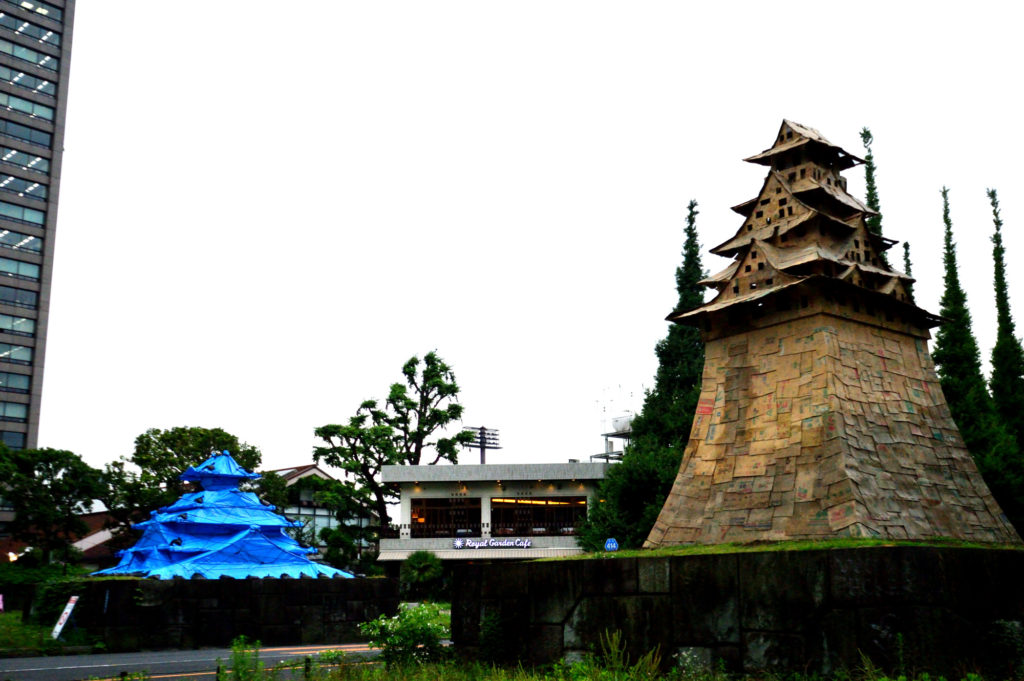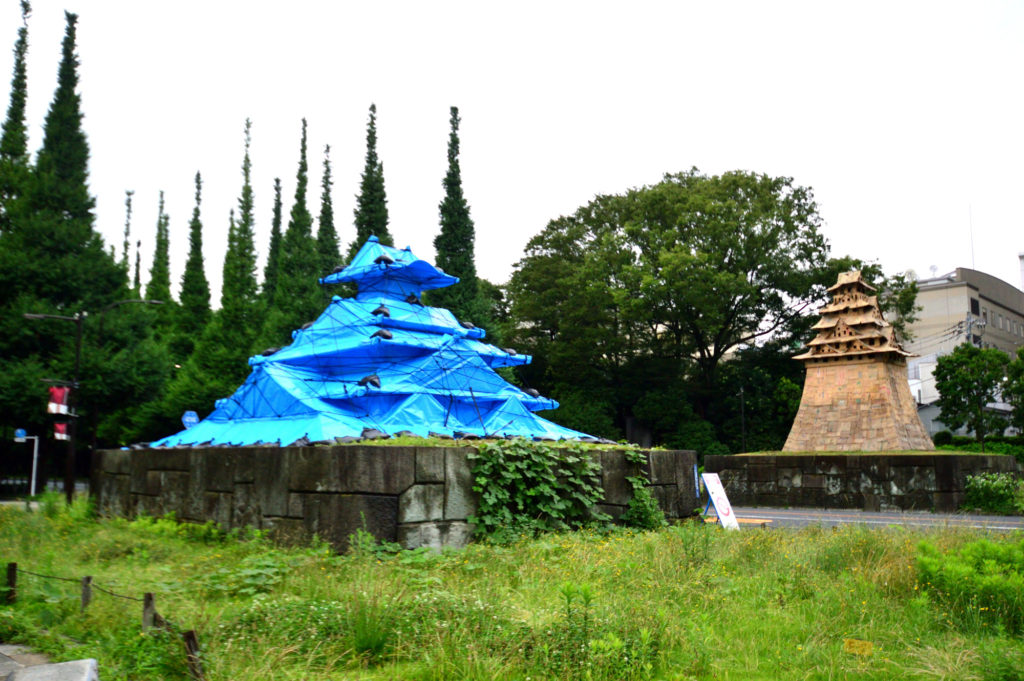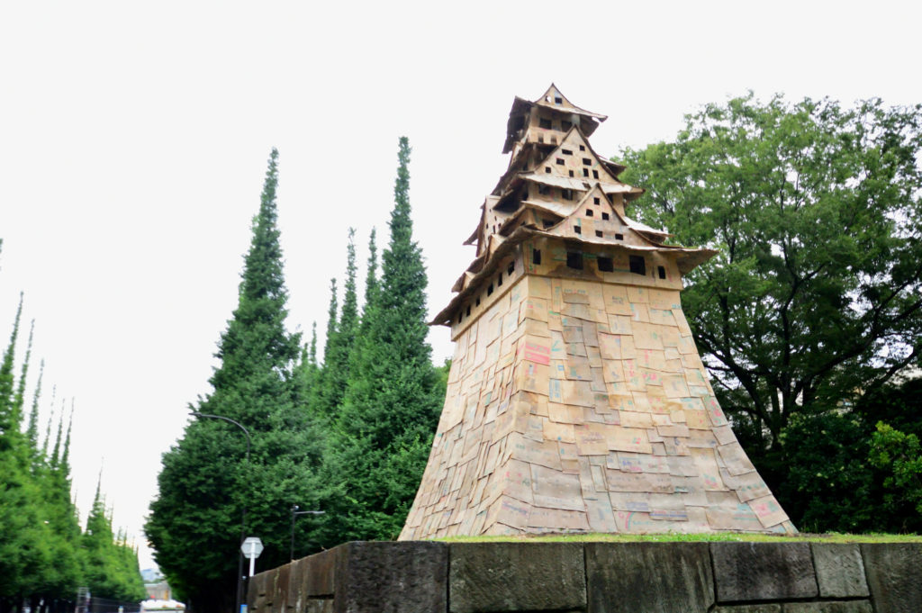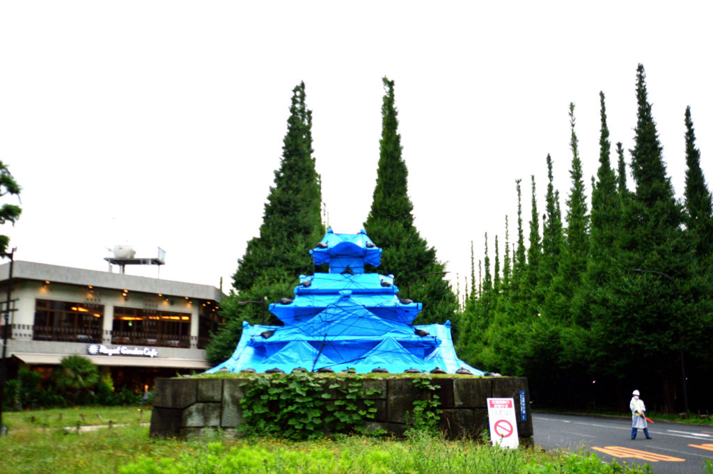 銀杏並木入口の石垣の上に突如現れた段ボールとブルシートを使ったお城が出現東京城