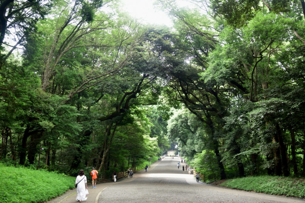 原宿駅の橋を渡り明治神宮に 原宿口参道 木々の緑が雨に洗われて