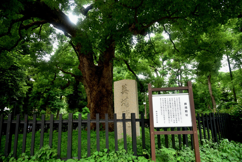 絵画館裏手に臨時の出入り口 ここから権田原方面に抜けたら絵画館裏手に明治天皇の斎場殿跡 知らなかった