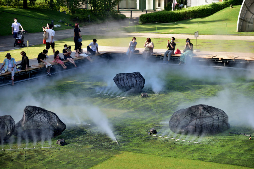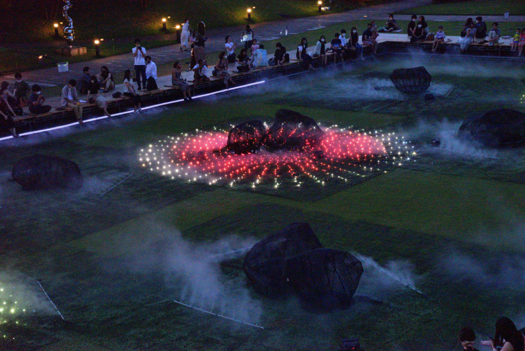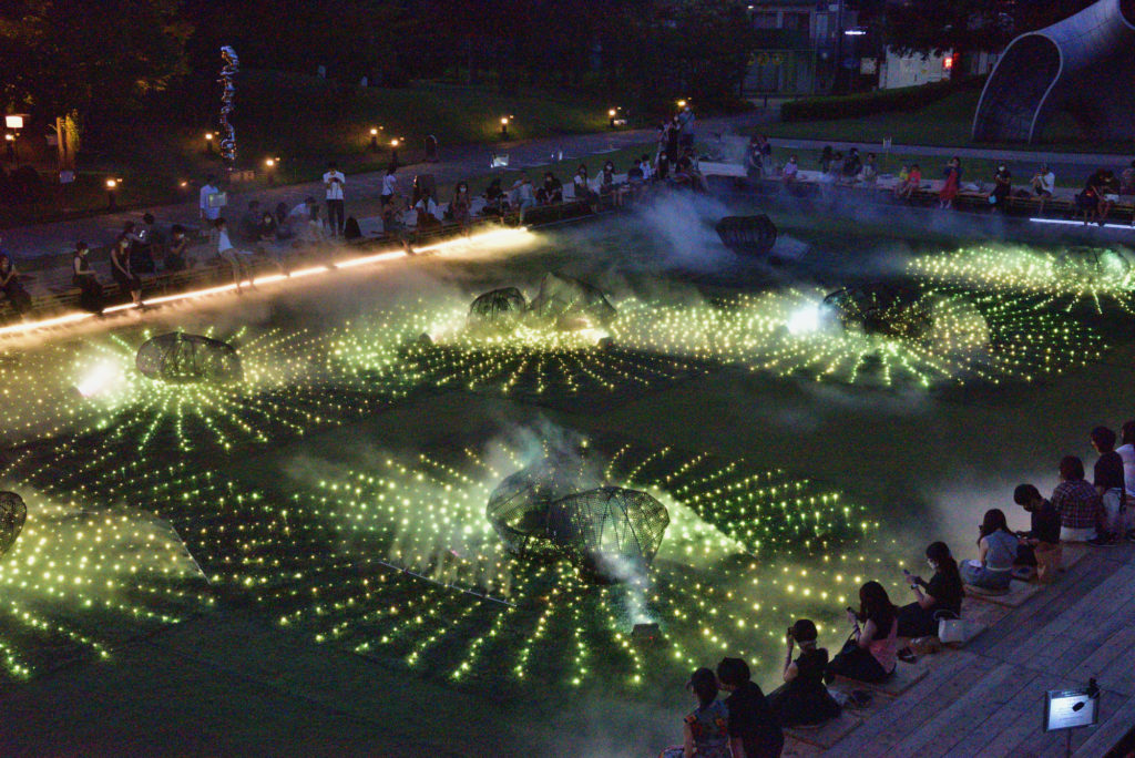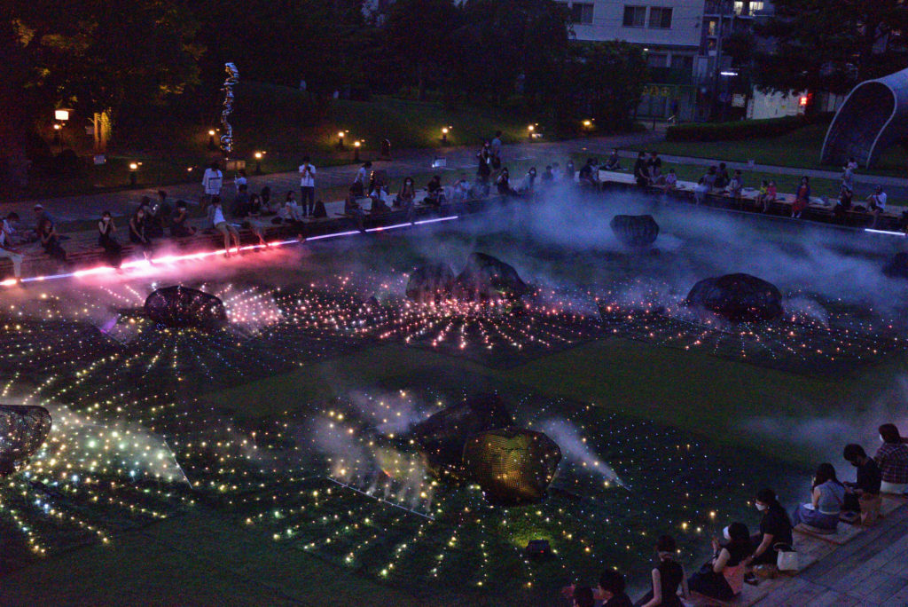 7/15-9/5迄ミットタウンで霧と光の演出をデジタル庭園として 15:00-18:00 15分間隔で霧の演出 18:00-20:00 15分間隔 光の演出 デジタル花火 庭園の周りには座れるようになってる 立ち見 厳禁 近くで写すと風の流れで霧が被り全体がボーと 本館の連絡する橋の上から