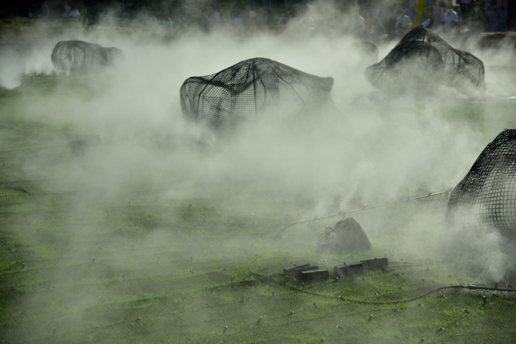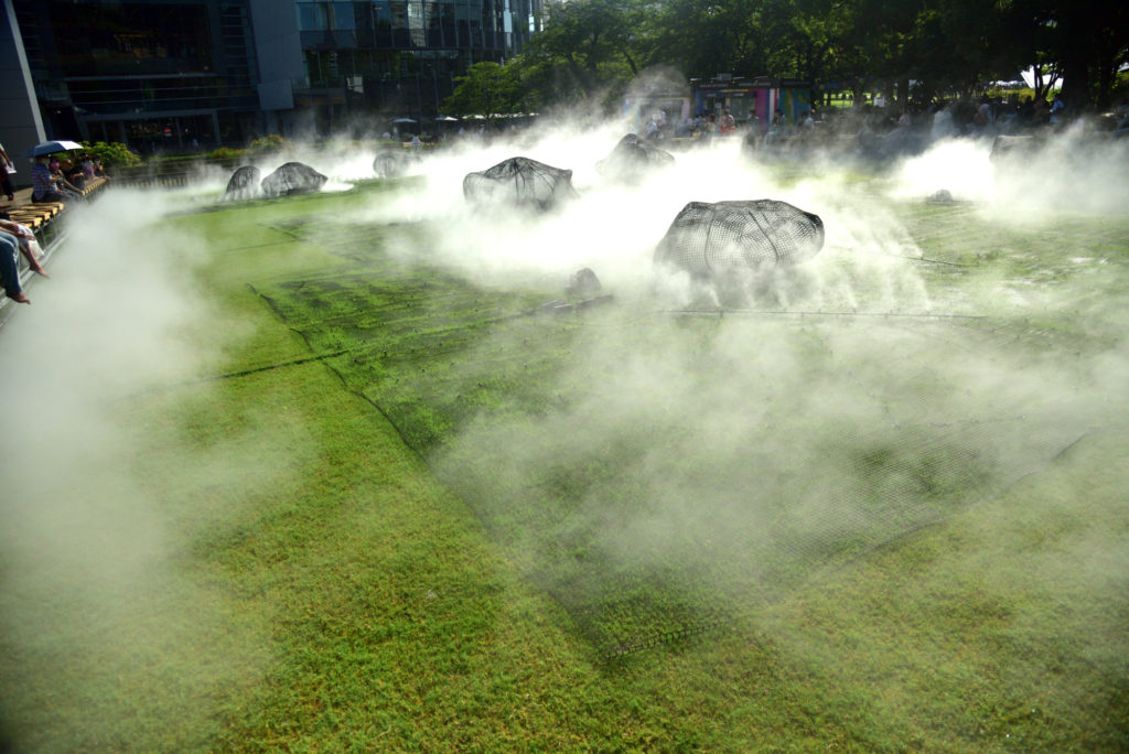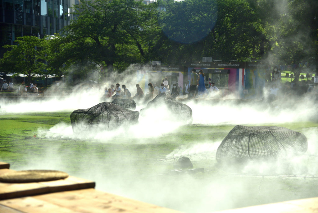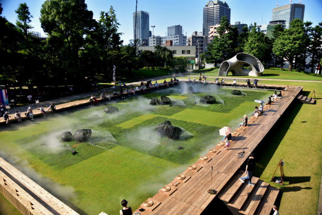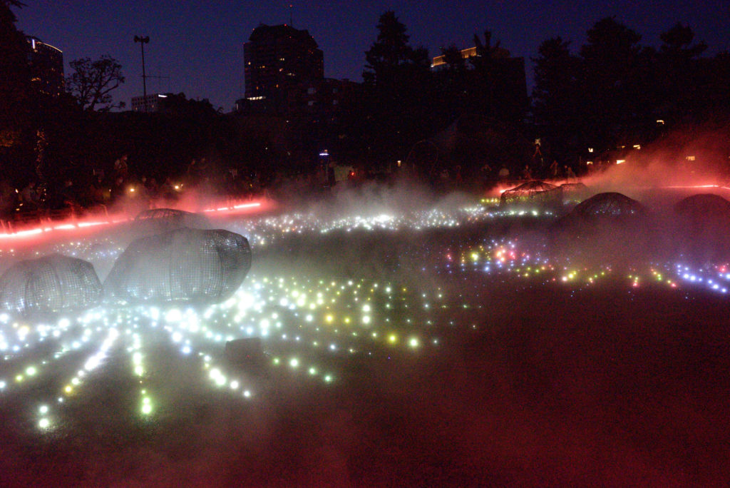 7/15-9/5迄ミットタウンで霧と光の演出をデジタル庭園として 15:00-18:00 15分間隔で霧の演出 18:00-20:00 15分間隔 光の演出 デジタル花火 庭園の周りには座れるようになってる 立ち見 厳禁 近くで写すと風の流れで霧が被り全体がボーと 本館の連絡する橋の上から
