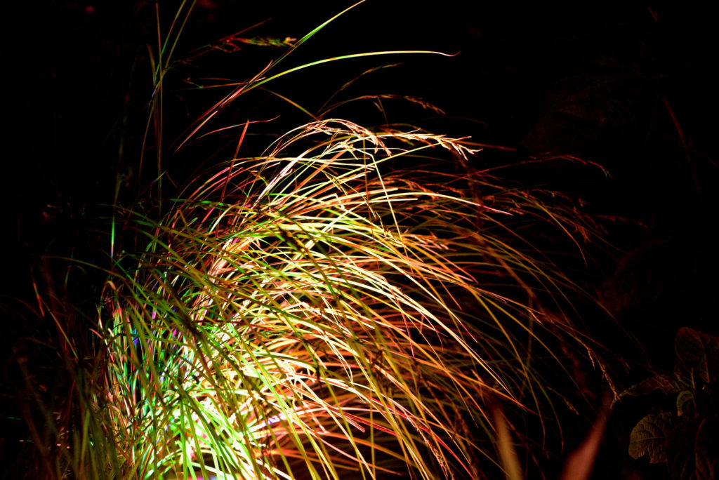 木の植え込みから3色のLEDでライトアップ