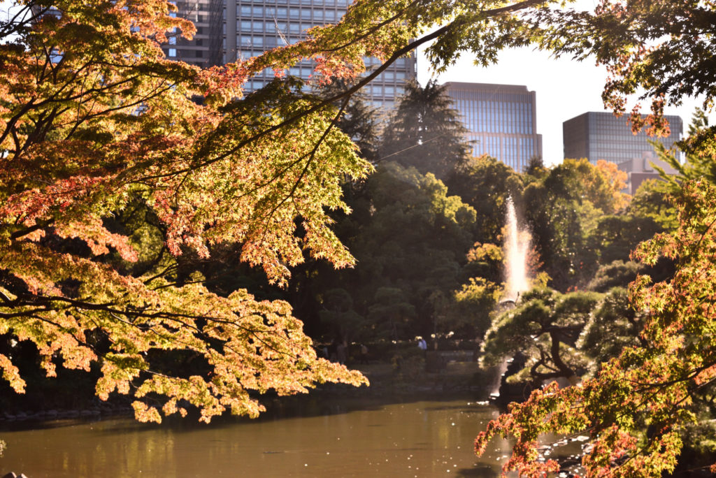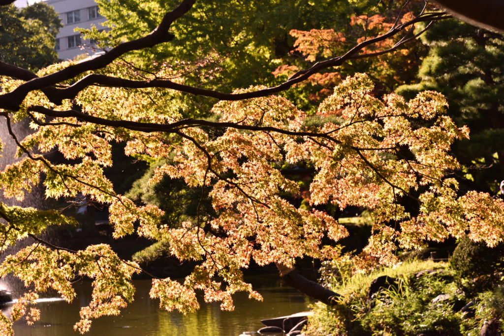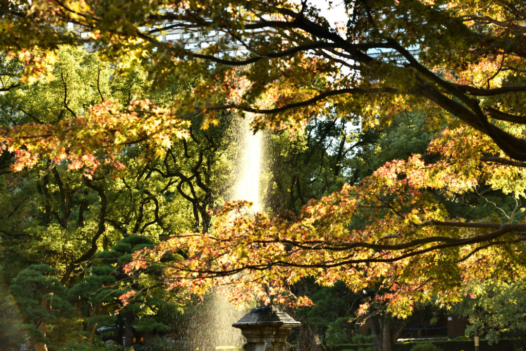 日比谷公園の紅葉 日本庭園の周囲のもみじ 間だちょっと早い その後 夜の大噴水公園 ライトアップ 時間と経過で色が変化