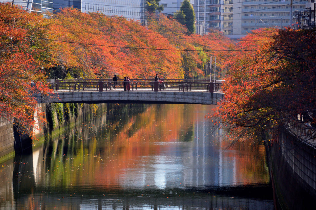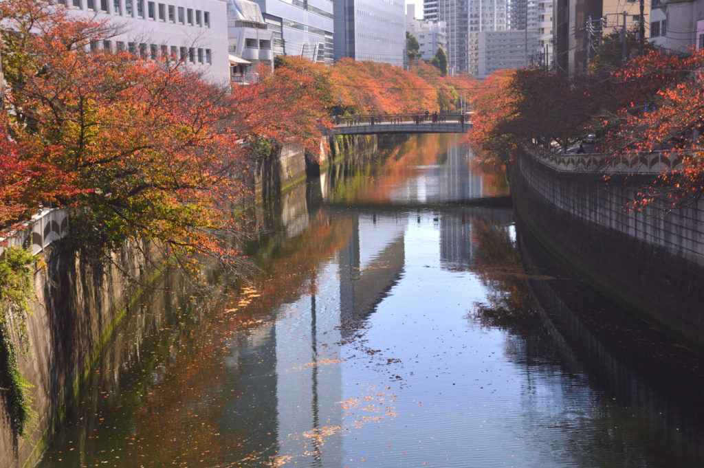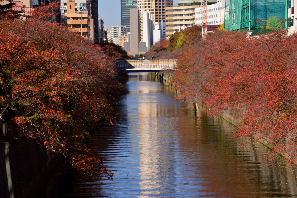 目黒新橋上から目黒川 両側は桜の木 春は桜 秋は紅葉 で楽しましてくれる