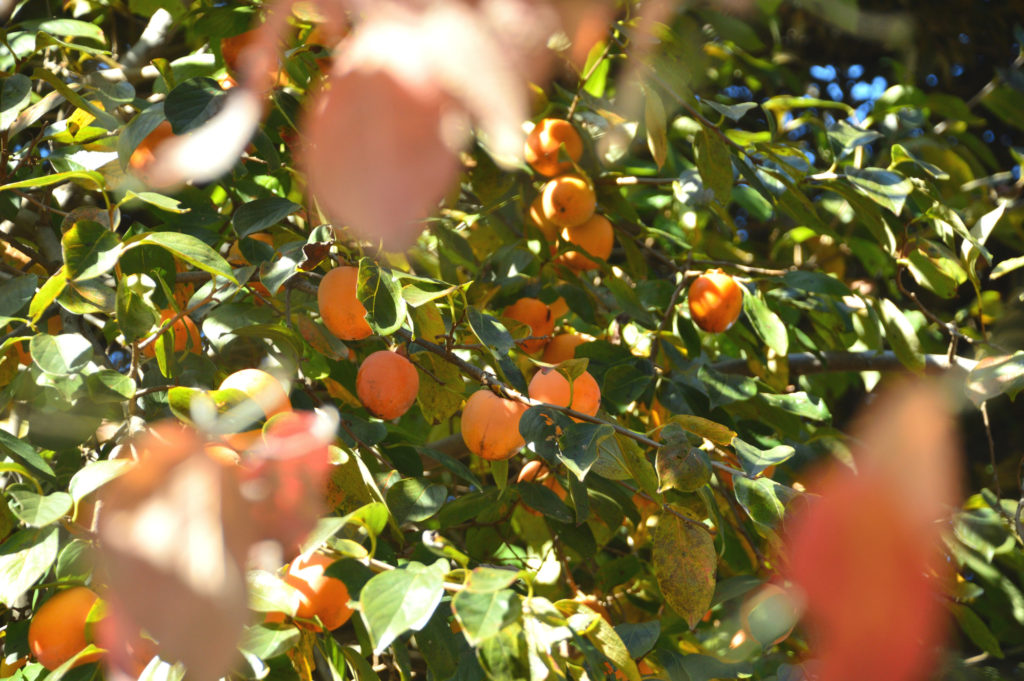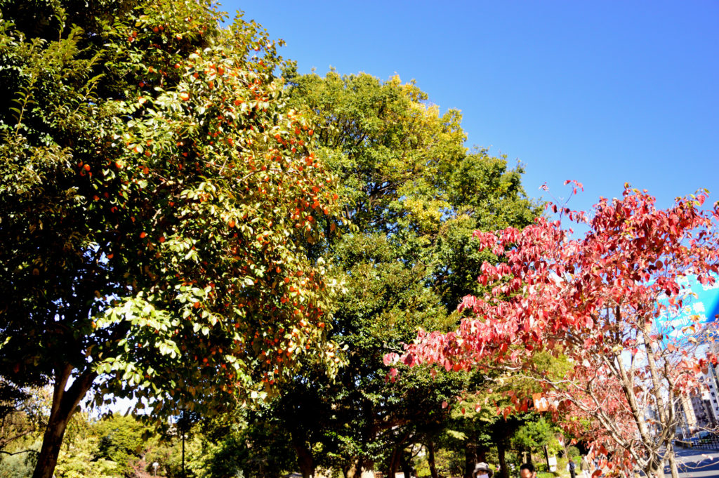 帰宅時白金庭園美術館に隣接する港区の公園 芝生の上では暖かいので子供連れの若い家族が三々五々 街路樹が赤くなり公園の柿がウラナリに
