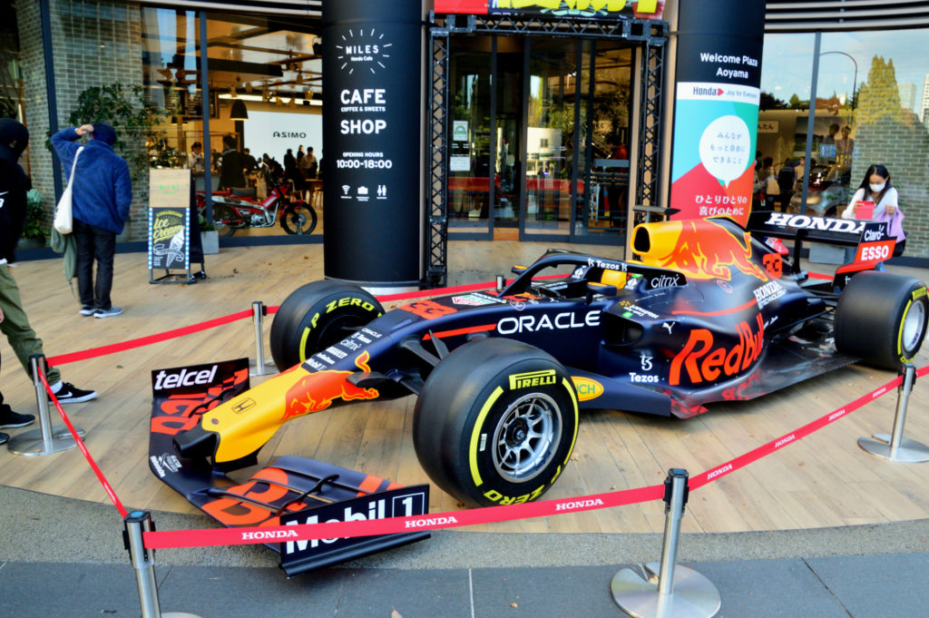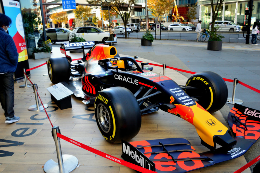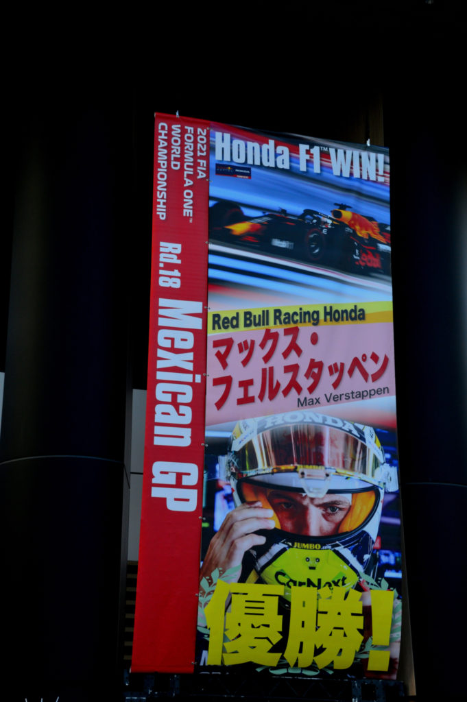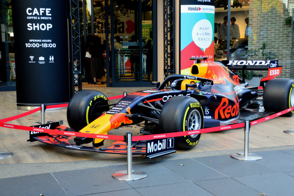 青山一丁目交差点角にあるホンダ 上から垂れ幕 メキシコGP 優勝 F1カーとチーム RED BULL