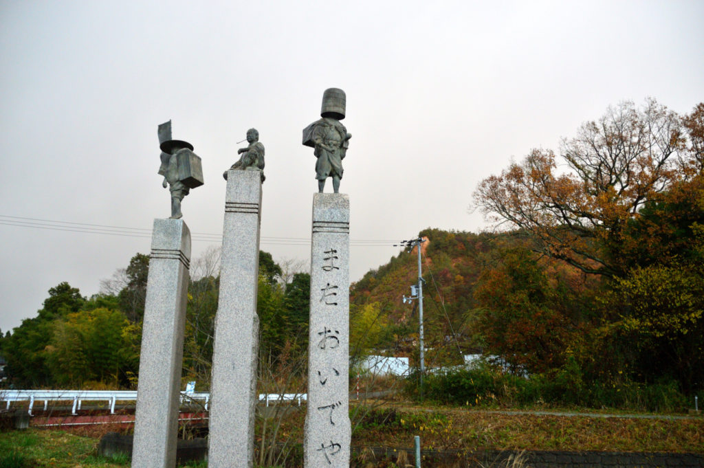 雨が降ってる 鳥居本宿 入り口にモニュメント 旅の恰好