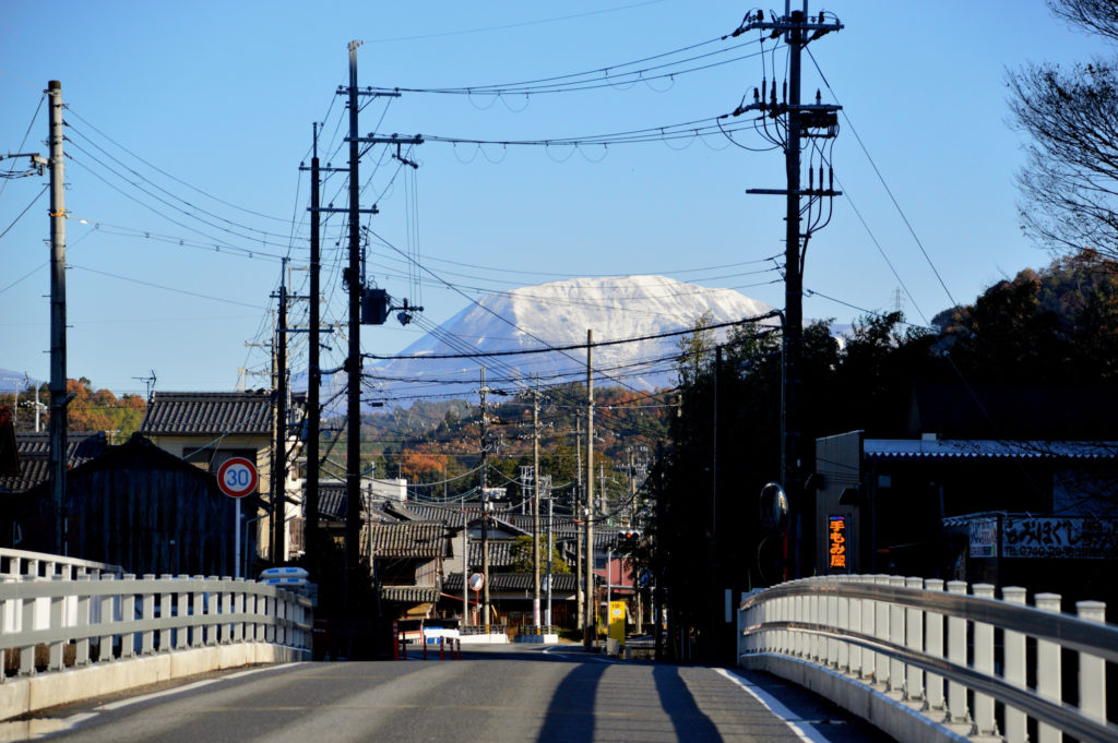 鳥居本宿から高宮宿に 芦川の橋から振り返ると雪をかぶった伊吹山