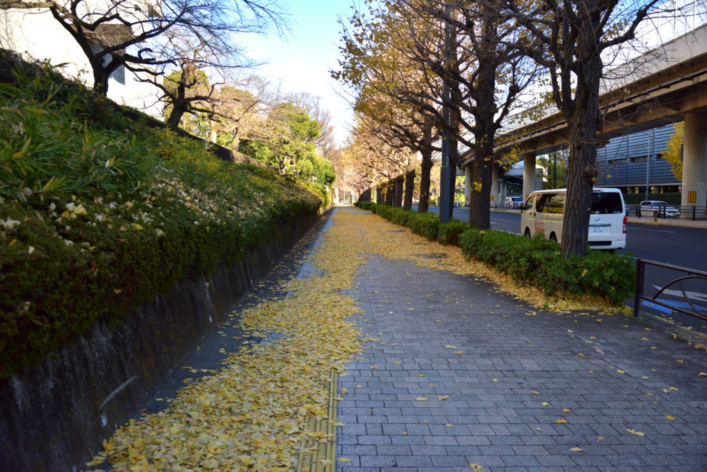 桜田門を抜け三宅坂 角のある最高裁横の道路 銀杏の葉が 風でこのように