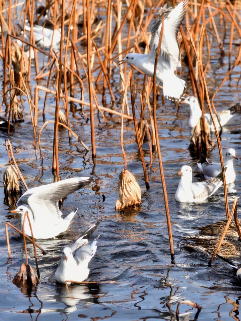 池のふちでカメラを担いだ人が大勢いる 聞いてみたらカワセミを追ってるらしい 自分も狙ったがハスが枯れて取りにピントが合わない 鳥は難しい