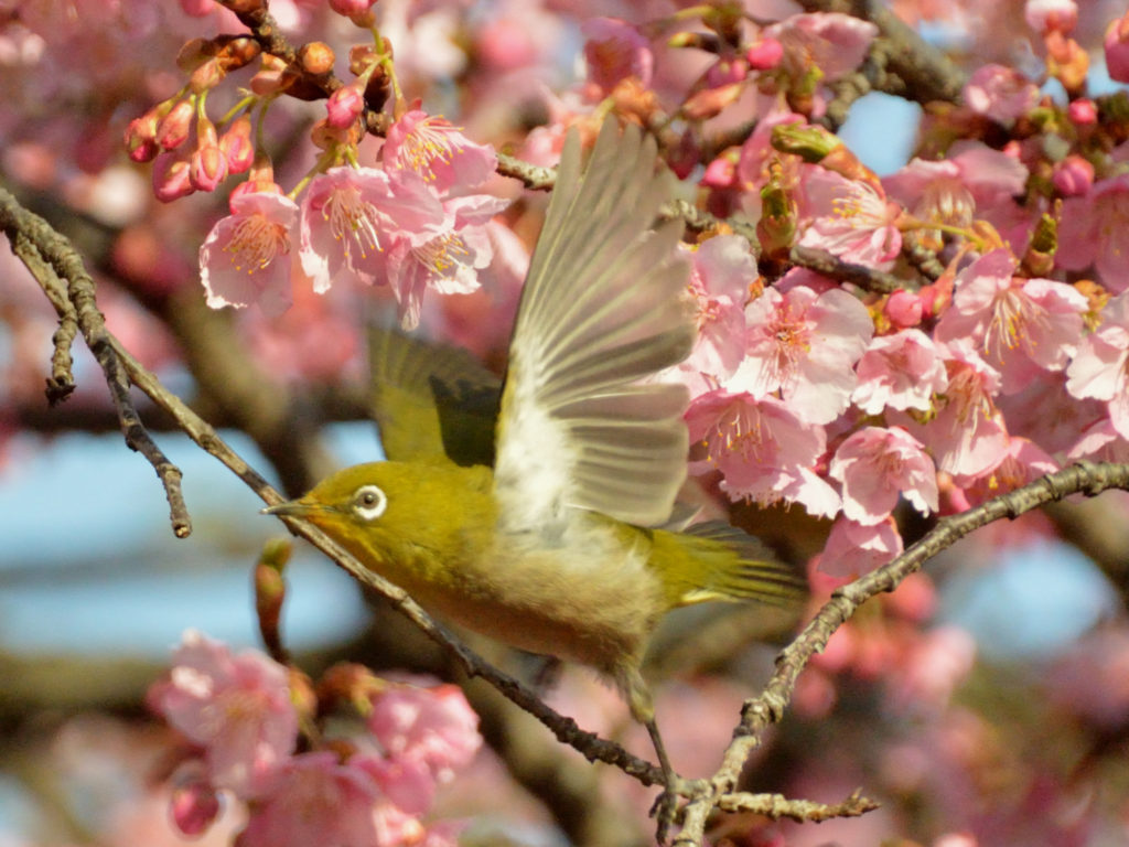 連写でやっと羽を広がた目白を写せた
