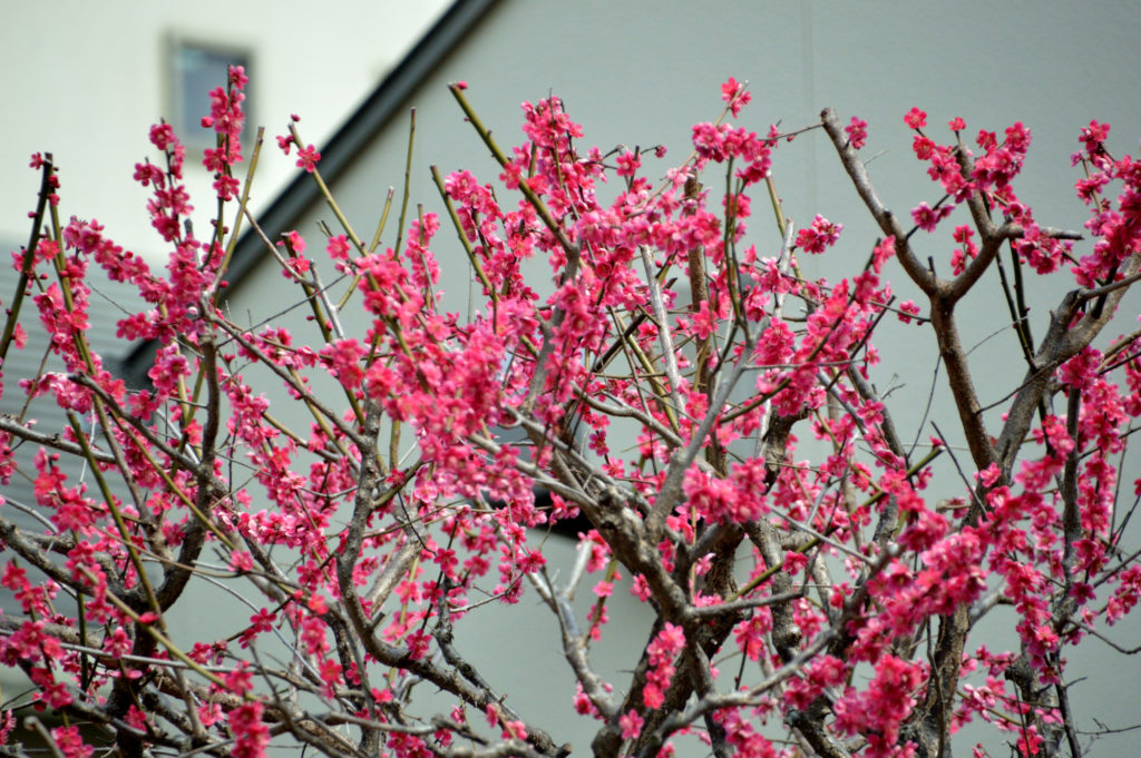 その前の家の庭に咲く紅梅 満開