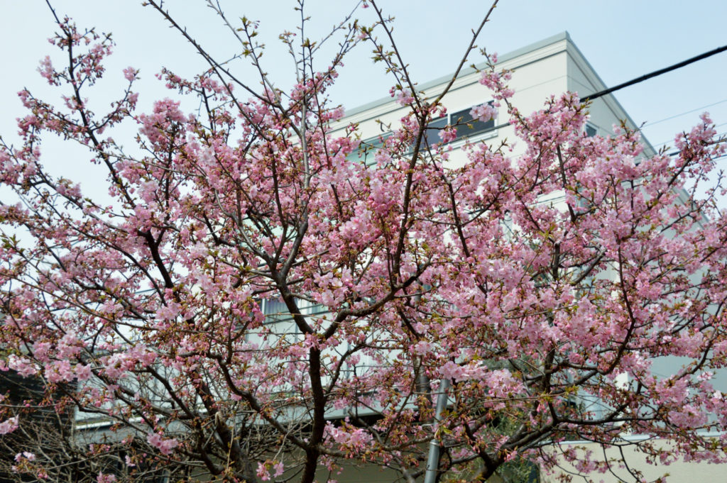 自由が丘の友人宅に自転車で 途中都立大前呑川緑地に入る この川沿いは桜が咲き始めると桜並木になる 桜が芽吹く前にひときわ目立つピンクの色 はやさきのカワヅサクラ