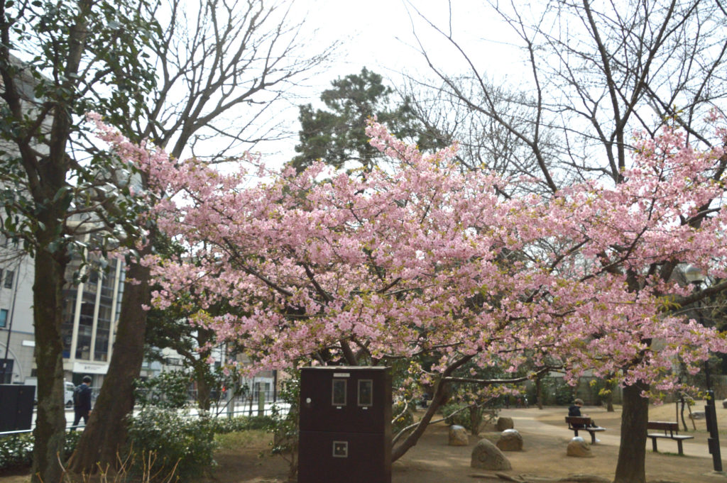 JR目黒駅を過ぎ白金科学博物館付属白金教育園前隣接する白金どんぐり児童公園に咲いてるカワヅサクラ