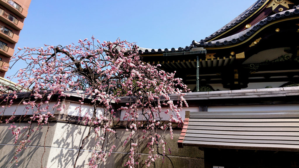 目黒通りから桜田通りに ここを右折して五反田方面に向かうところにある正福寺のしだれ梅