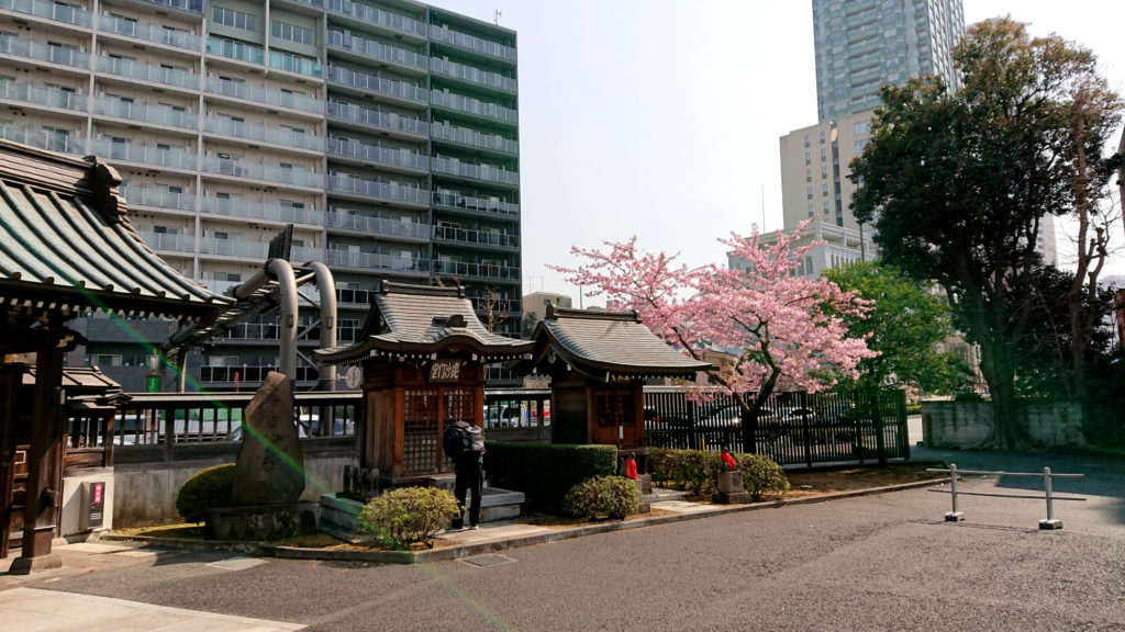 道路を渡り古川橋方面に戻る清正公 覚林寺境内にあるカワヅサクラ