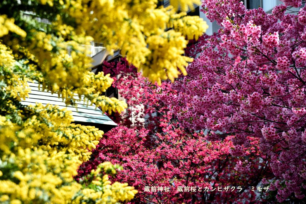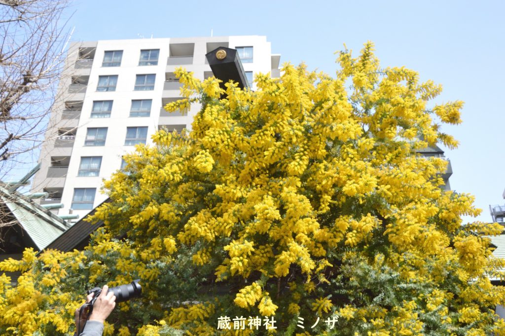 テレビで蔵前神社のピンクの桜と黄色いミモザが紹介されてた こんなに早く満開になるとは 早速行くことにした 台東区蔵前 江戸通りを右折 隅田川に近いところにある小さい神社 午前10時頃なのに人が多い 午後の人出を想像すると軽ダウが人で埋まるのではないか