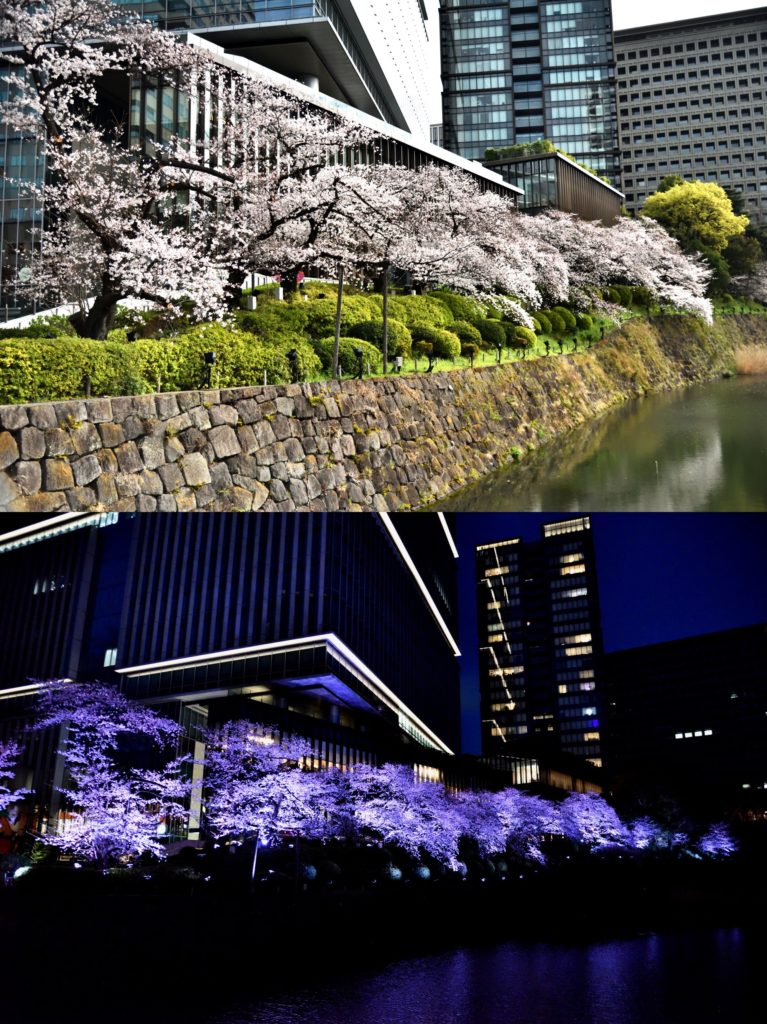 自宅から青一交差点を右折 赤坂御所(4月から仙胴御所となる)に沿って赤坂見附 弁慶濠に咲き始めた桜 いろいろな場所を回り帰路にライトアップしていた