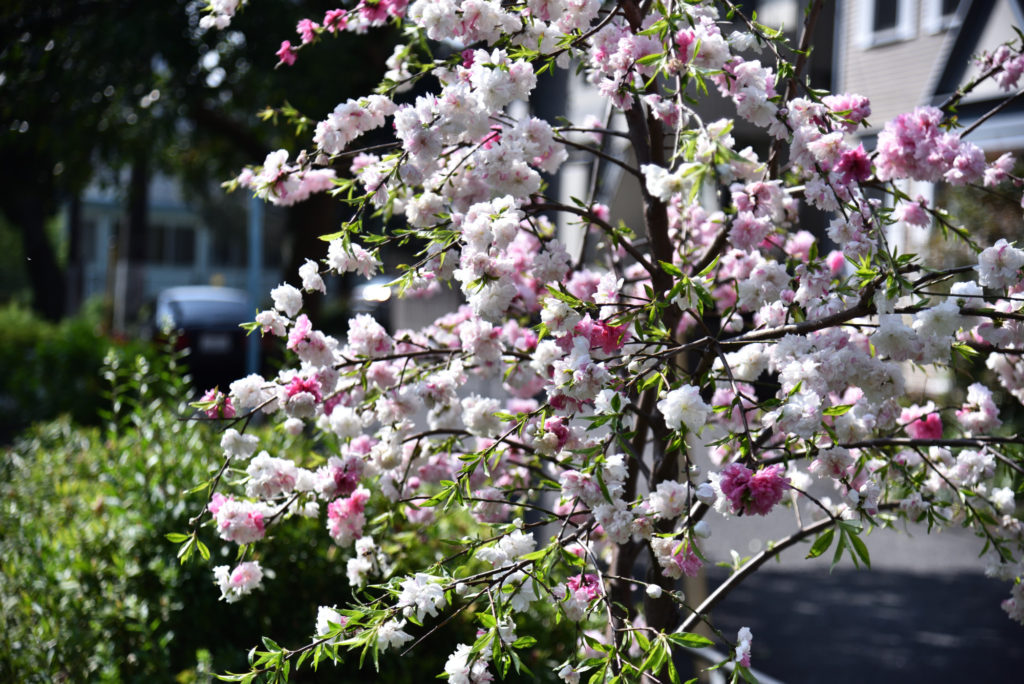 午前中 品川午後自宅 八重の桜が咲き始めた 青山公園には3本あり咲き始めてるし花桃が白とピンクの花が