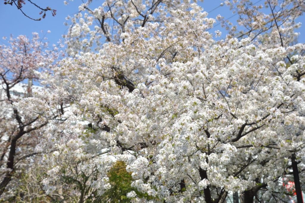 高輪佛所護念会 高輪教会 桜の品種はわからないが満開 白が見事